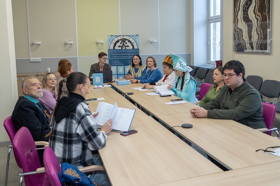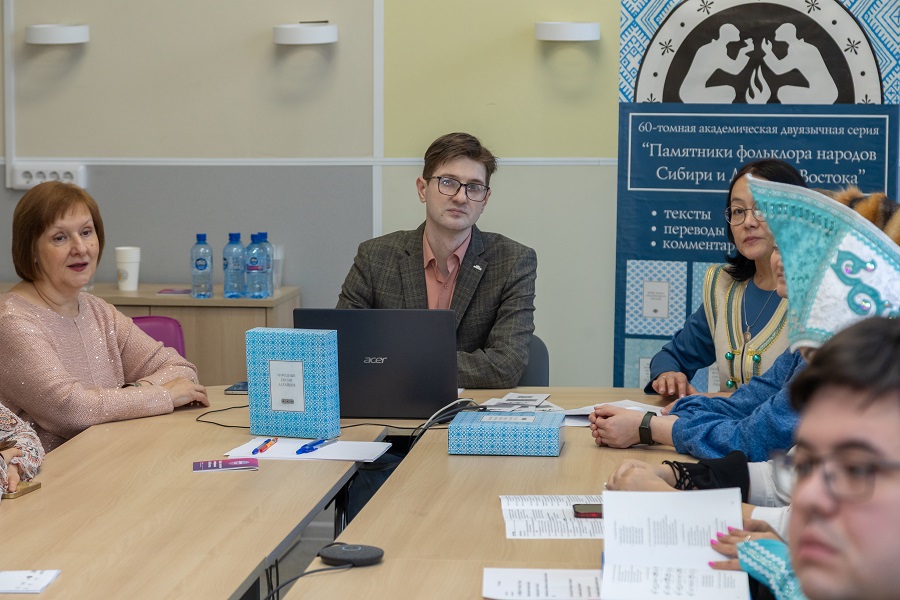 «С момента выхода в 1990 году первого тома серии "Памятники фольклора народов Сибири и Дальнего Востока" прошло ровно 35 лет. Знаменательно, что в этом году вышел в свет 35-ый том Серии. Это свидетельствует об устойчивом, планомерном развитии книжной серии и верности выработанным принципам академического издания», – начиная встречу отметил модератор мероприятия зам. директора по научной работе ИФЛ СО РАН, зав. Научным центром по изучению региональных и традиционных музыкальных культур Новосибирской консерватории, канд. искусствоведения Шахов Павел Сергеевич.