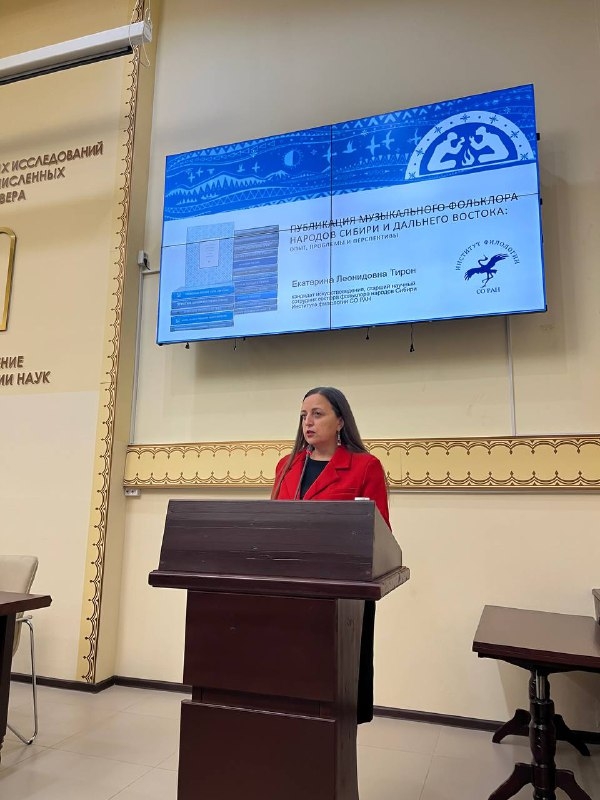 Институт филологии СО РАН на конференции представила старший научный сотрудник сектора фольклора народов Сибири, кандидат искусствоведения Екатерина Леонидовна Тирон, выступив на пленарной сессии с докладом «Публикация музыкального фольклора народов Сибири и Дальнего Востока: опыт, проблемы и перспективы», в котором рассказала о подготовке музыковедческих разделов томов академической серии «Памятники фольклора народов Сибири и Дальнего Востока».