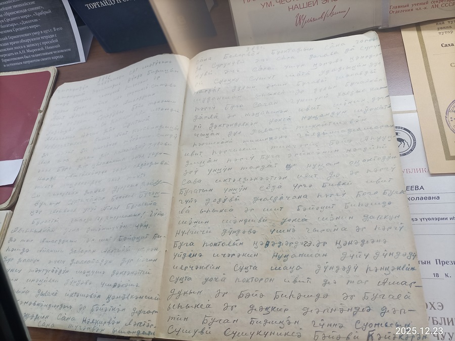 В рамках конференции в Музее истории науки Якутии им. Г.П. Башарина состоялось открытие выставки «Анна Николаевна Мыреева – ученый, просветитель, гуманист», на которой представлены уникальные документы и фотографии, связанные с деятельностью исследователя. Так, здесь экспонированы известные в фольклористическом мире рукописные тетради Николая Гермагеновича Трофимова – последнего эвенкийского сказителя. Тексты из этих тетрадей составили основу корпуса тома «Эвенкийские героические сказания», подготовленного Анной Николаевной Мыреевой и опубликованного в 1990 году в качестве первого тома серии «Памятники фольклора народов Сибири и Дальнего Востока» (с трагической историей уникальных рукописных тетрадей можно познакомиться в материале Дианы Хомяковой, опубликованном в «Науке в Сибири»). Интересна также фотография, запечатлевшая встречу Анны Николаевны с Александром Бадмаевичем Соктоевым, инициатором серии.