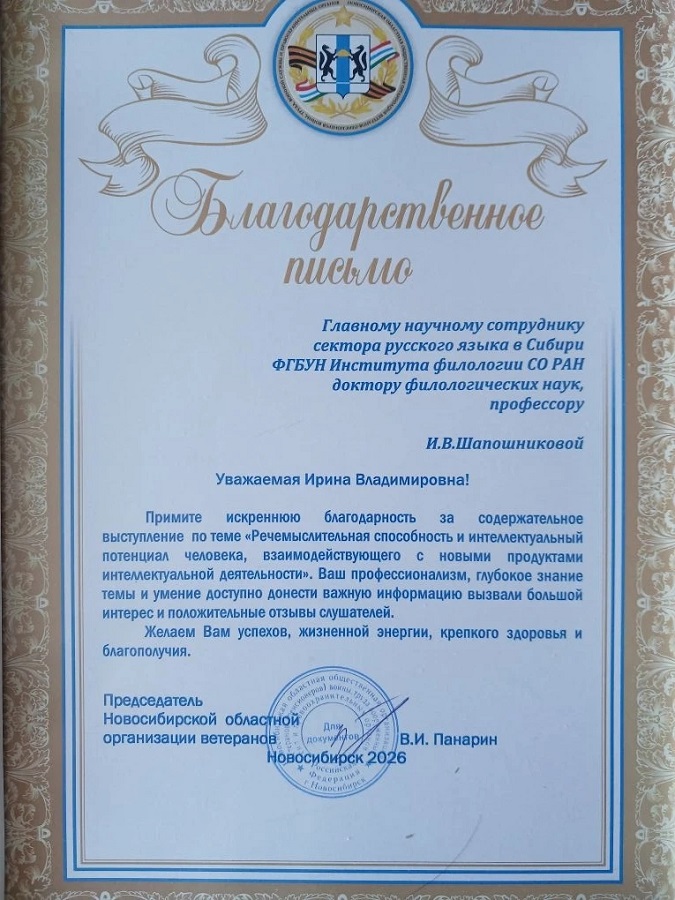 В рамках семинаров была проведена стратегическая сессия «Искусственный интеллект: благо и риски», на которой выступила главный научный сотрудник сектора русского языка в Сибири Института филологии СО РАН, доктор филологических наук, профессор Ирина Владимировна Шапошникова и заведующий лабораторией аналитики потоковых данных и машинного обучения Новосибирского государственного университета Евгений Николаевич Павловский. На семинаре первого потока они выступили с совместной лекцией «Искусственный интеллект: благо и риски», в которой доступно и ярко осветили одну из самых обсуждаемых тем современности. На стратегической сессии второго потока И. В. Шапошникова выступила с докладом «Речемыслительная способность и интеллектуальный потенциал человека, взаимодействующего с новыми продуктами интеллектуальной деятельности».