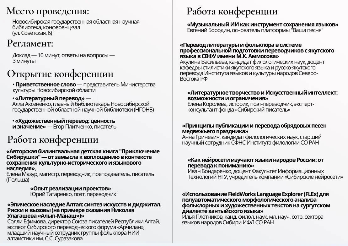 Значительная часть программы была посвящена опыту национальных республик и академическим исследованиям. Солли Ефимова, директор Союза писателей Республики Алтай, эксперт Сибирского переводческого форума «Арчилан», поделилась размышлениями о рисках и вызовах, которые возникают при адаптации эпического наследия для массового читателя с использованием ИИ-агентов, на примере сказания Николая Улагашева «Алып-Манаш». Солли обратила внимание на значительные искажения традиционной сюжетной рамки и символики эпоса при обработке текста с помощью ИИ.